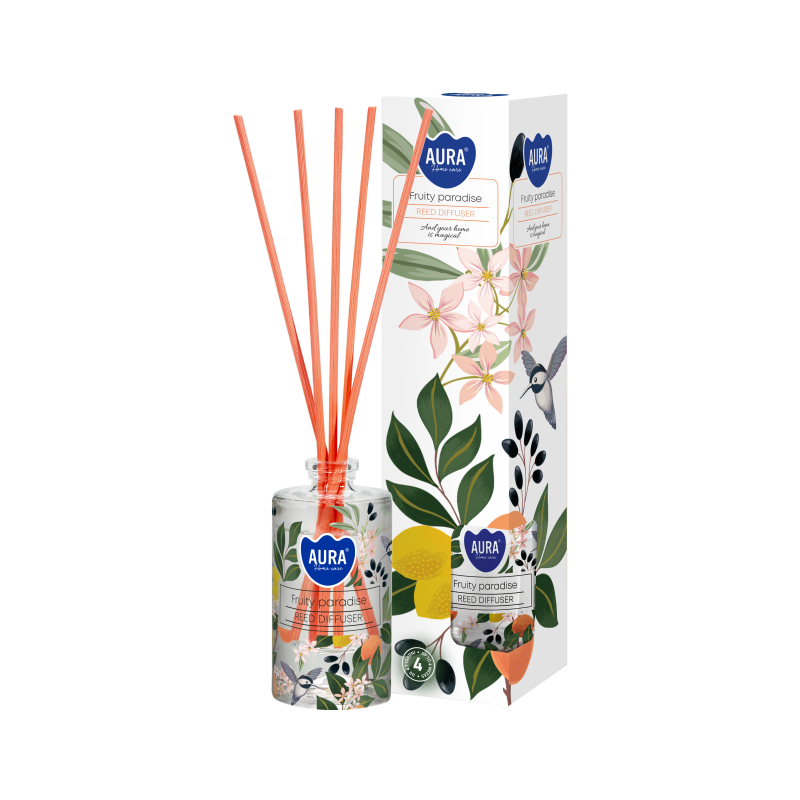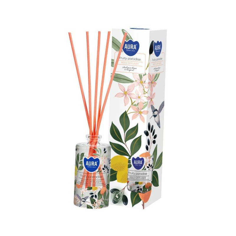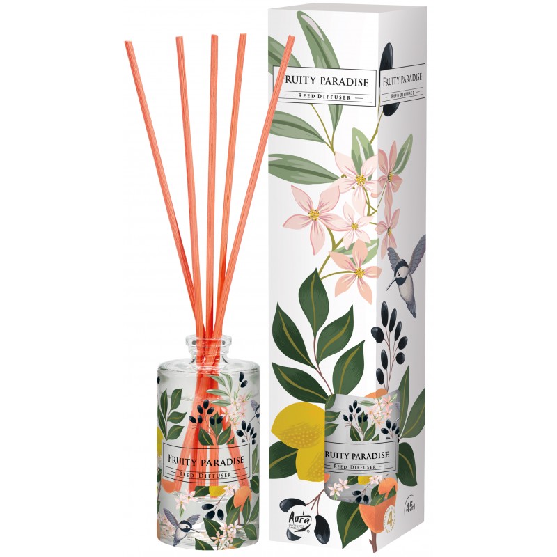 Dyfuzor zapachowy z patyczkami, owocowy raj o pojemności 45ml i trwałości zapachu do 4 tygodni BISPOL.