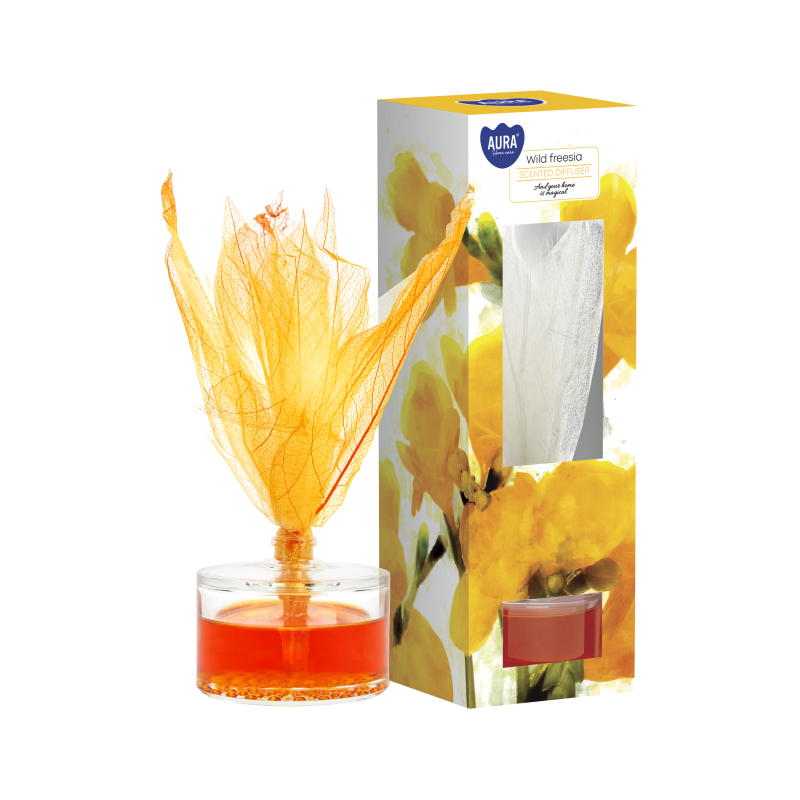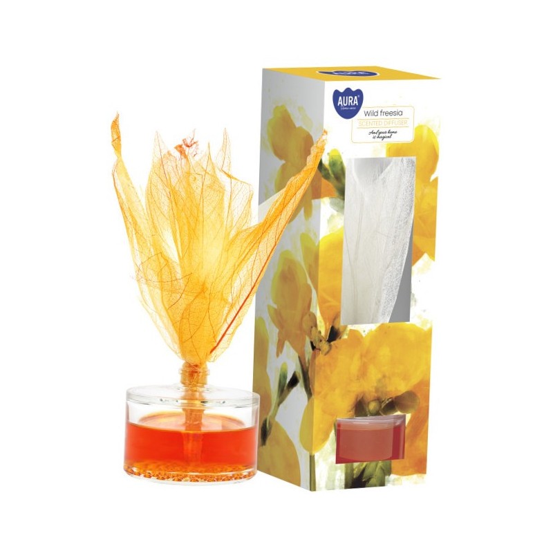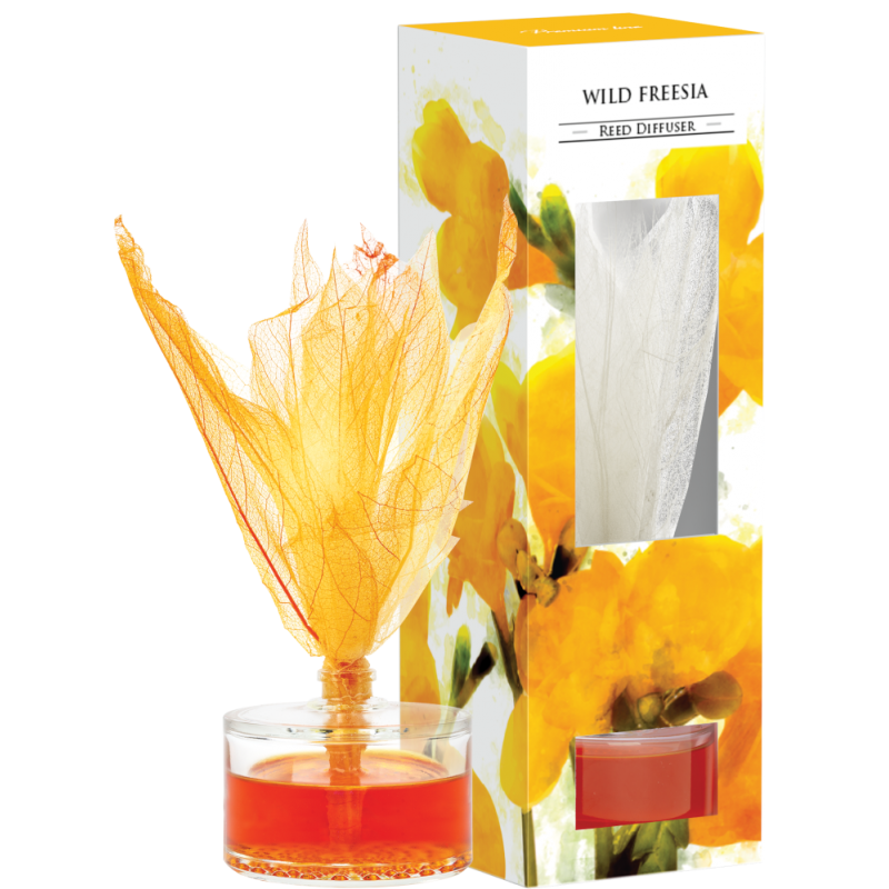 Dyfuzor zapachowy z liściem, dzika frezja o pojemności 50ml i trwałości zapachu do 4 tygodni BISPOL.
