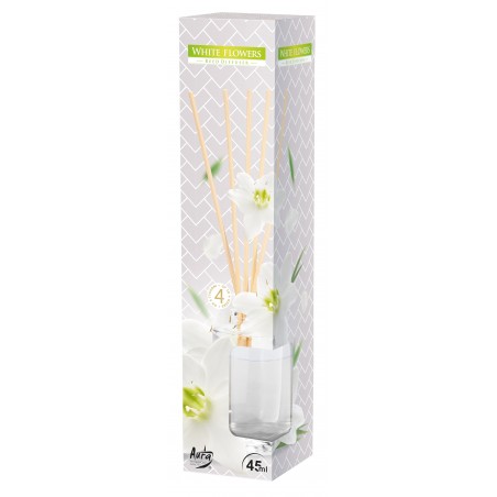 Dyfuzor zapachowy z patyczkami, białe kwiaty o pojemności 45ml i trwałości zapachu do 4 tygodni BISPOL.