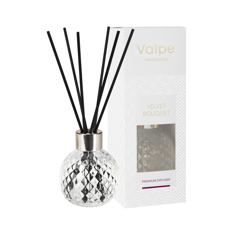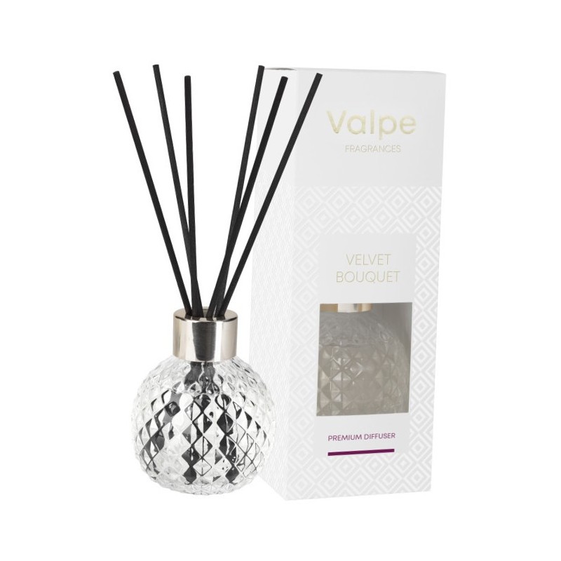 Dyfuzor zapachowy VALPE aksamitny bukiet, z patyczkami, w eleganckim szkle o strukturze kryształu, pojemności 100ml i trwałości zapachu do 9 tygodni BISPOL.