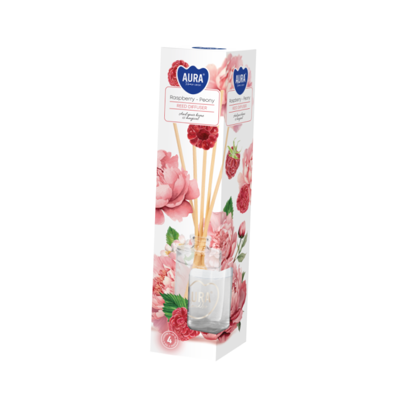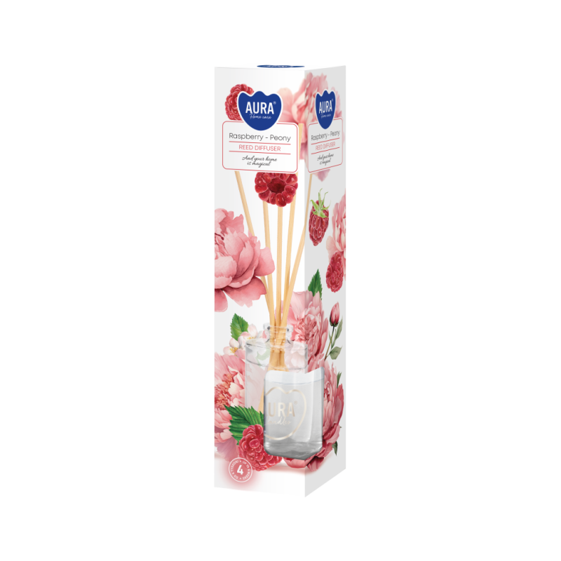 Dyfuzor zapachowy z patyczkami, malina - piwonia o pojemności 45ml i trwałości zapachu do 4 tygodni BISPOL.