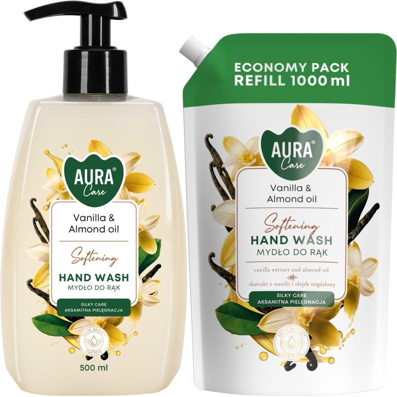 Kremowe mydło w dozowniku (500 ml) + zapas 1000ml o relaksującym zapachu Wanilii i Olejku migdałowego.