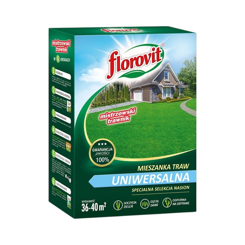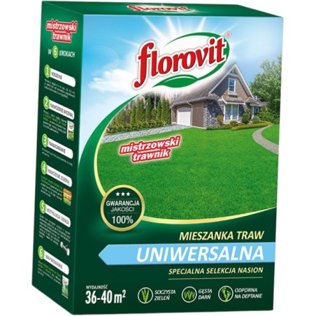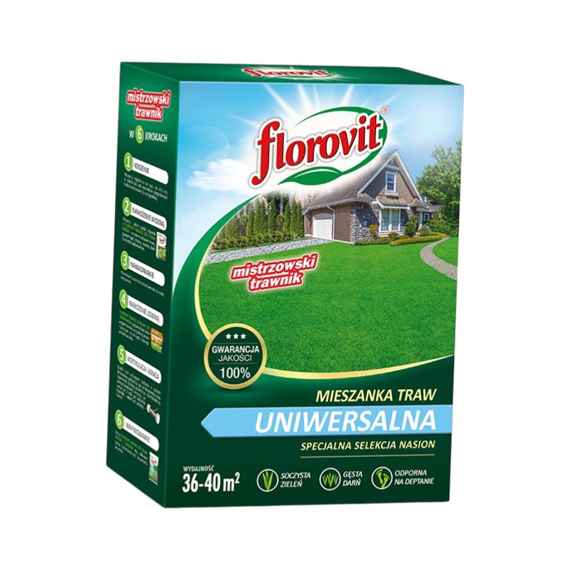 Florovit mieszanka traw uniwersalna to wszechstronna kompozycja wyselekcjonowanych odmian traw gazonowych, stworzona z myślą o szerokim zastosowaniu w ogrodach przydomowych i terenach zieleni miejskiej. Mieszanka ta łączy w sobie cechy trawy ozdobnej (estetyczny wygląd) z cechami trawy użytkowej (odporność na deptanie). Charakteryzuje się dobrą dynamiką wzrostu, soczystą zielenią oraz zdolnością do adaptacji w różnych warunkach glebowych. Tworzy zwartą i trwałą darń, która dobrze znosi zmienne warunki pogodowe typowe dla naszego klimatu.