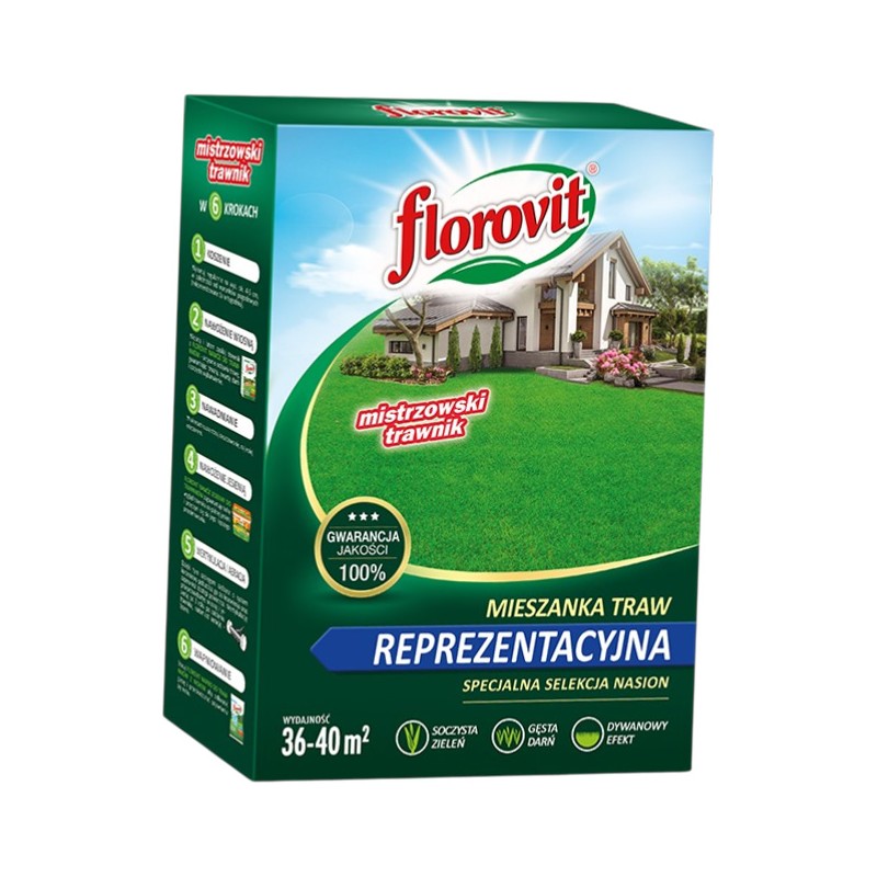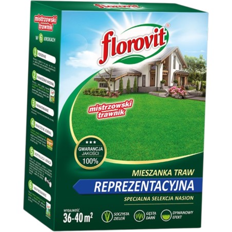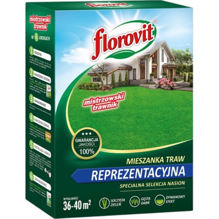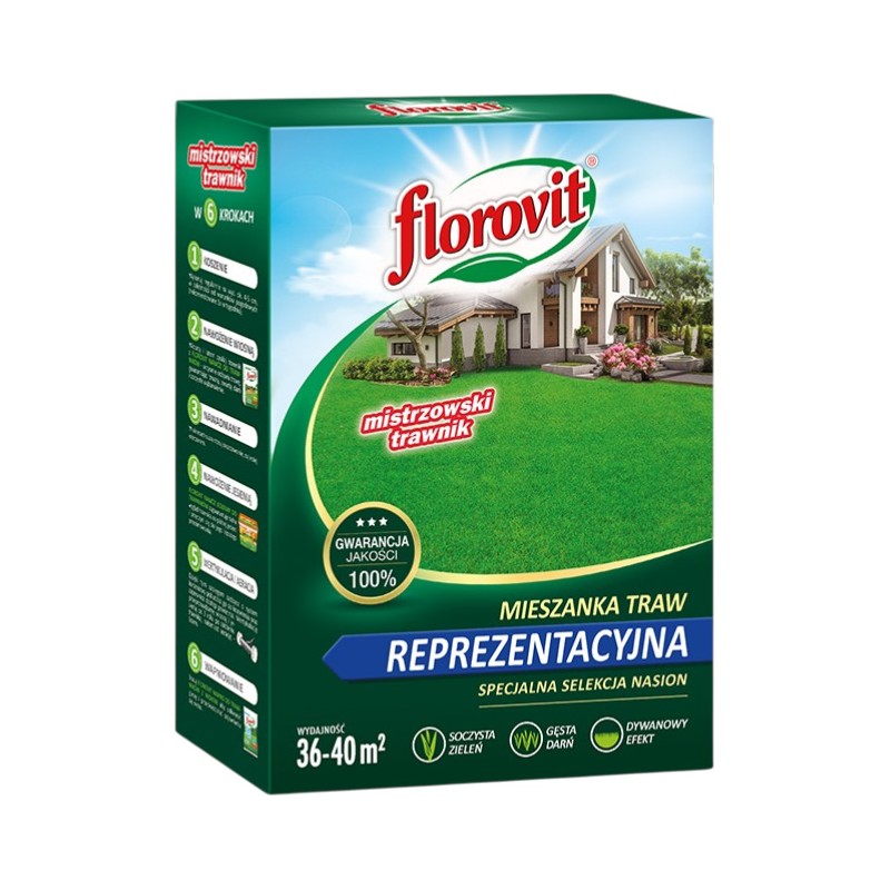Florovit mieszanka traw reprezentacyjna to ekskluzywna kompozycja nasion traw gazonowych, stworzona dla osób pragnących uzyskać efekt „angielskiego trawnika”. Składa się z wyselekcjonowanych odmian o drobnych liściach i powolnym wzroście, co pozwala na uzyskanie wyjątkowo gęstej, zwartej i intensywnie zielonej darni o strukturze miękkiego dywanu. Mieszanka ta stawia na najwyższe walory estetyczne, tworząc prestiżową oprawę dla domów jednorodzinnych, rezydencji oraz reprezentacyjnych części ogrodów.