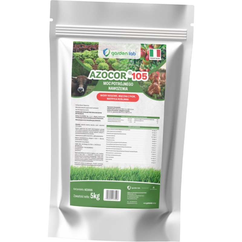 Nawóz organiczny z wiórów rogowych i mączki z piór GARDEN LAB Azocor 105 to profesjonalny, w pełni organiczny nawóz azotowy, który łączy w sobie tradycyjną moc wiórów rogowych z nowoczesną formą matrycy roślinnej. To rozwiązanie dla ogrodników ceniących ekologię i długofalowe efekty bez ryzyka przenawożenia.