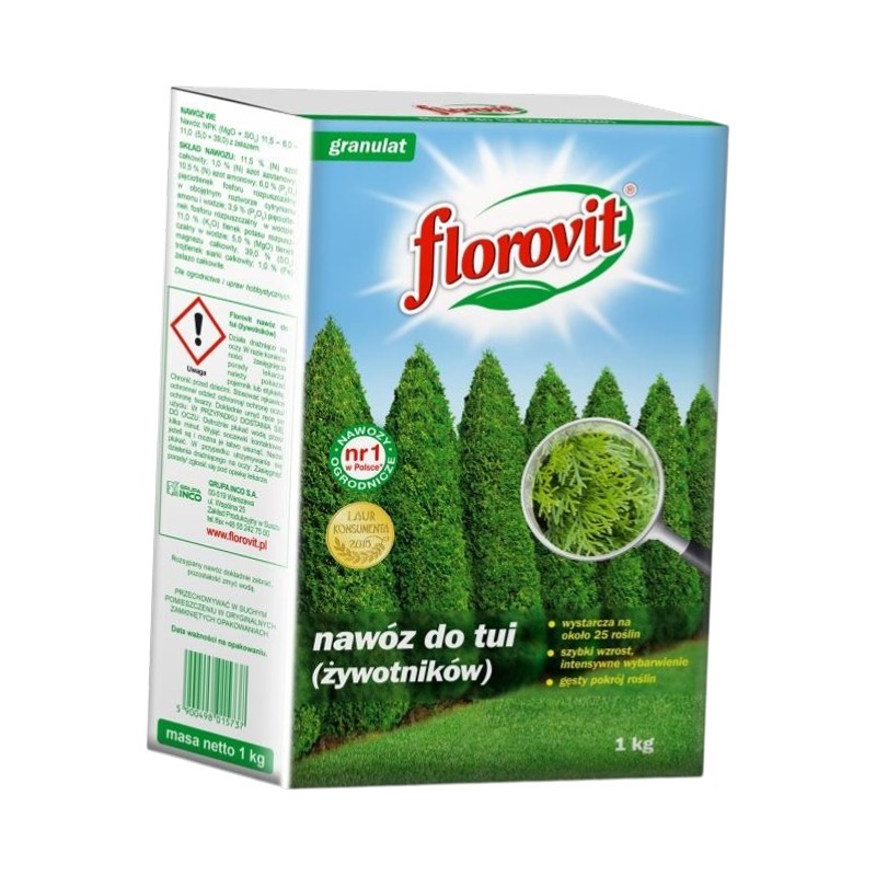 Florovit nawóz do tui (żywotników) to specjalistyczny nawóz mineralny, który zawiera składniki pokarmowe w formach i ilościach idealnie dopasowanych do wymagań tych roślin. Regularne stosowanie preparatu gwarantuje szybki i prawidłowy wzrost, zapewnia intensywne wybarwienie igieł oraz zwiększa odporność tui na choroby i wymarzanie. Dzięki niemu żywopłoty stają się gęste i bujne.