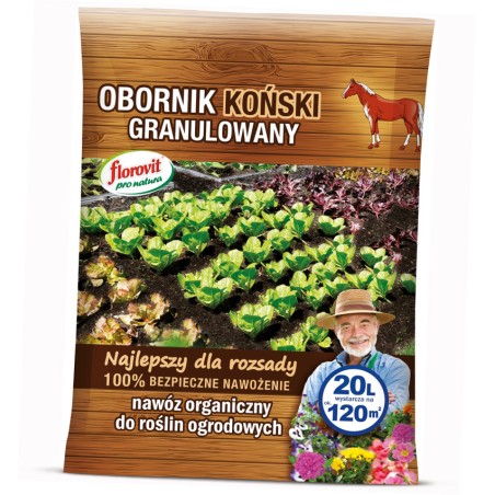 Florovit Pro Natura Obornik Koński Granulowany to w 100% naturalny, bezpieczny i ekologiczny nawóz organiczny w formie suchych granul. Jest szczególnie ceniony przez ogrodników ze względu na swoje właściwości grzejne – podczas rozkładu wydziela ciepło, co sprzyja szybszemu nagrzewaniu się podłoża i lepszemu ukorzenianiu roślin. Jest to nawóz o odczynie zbliżonym do obojętnego, który poprawia strukturę gleby, zwiększa jej przewiewność i zdolność do zatrzymywania wody. Dzięki procesowi granulacji jest łatwy w użyciu, pozbawiony nieprzyjemnego zapachu oraz wolny od chwastów i patogenów.