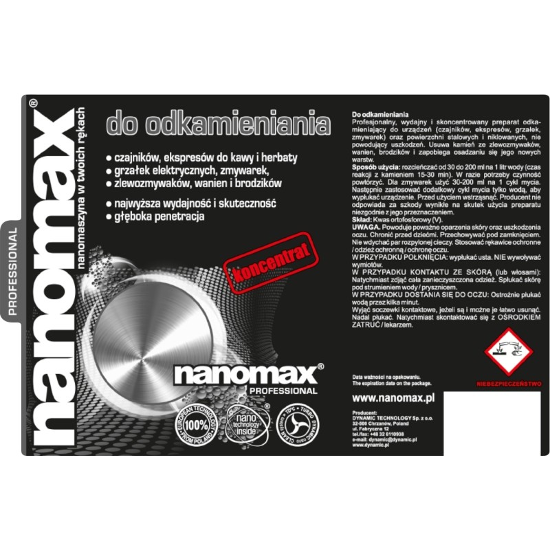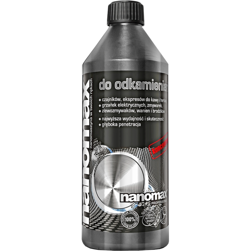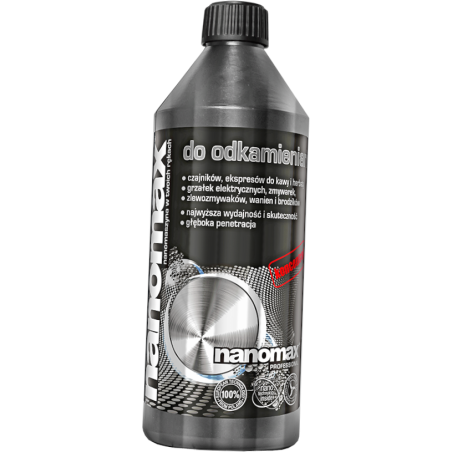 Środek do odkamieniania NANOMAX Professional 1L - to silnie skoncentrowany preparat do usuwania osadów wapiennych, kamienia kotłowego, rdzy oraz innych nieczystości mineralnych. Doskonale sprawdza się w czyszczeniu urządzeń AGD, armatury łazienkowej, kabin prysznicowych, kafelków, toalet, czajników, ekspresów do kawy czy pralek.