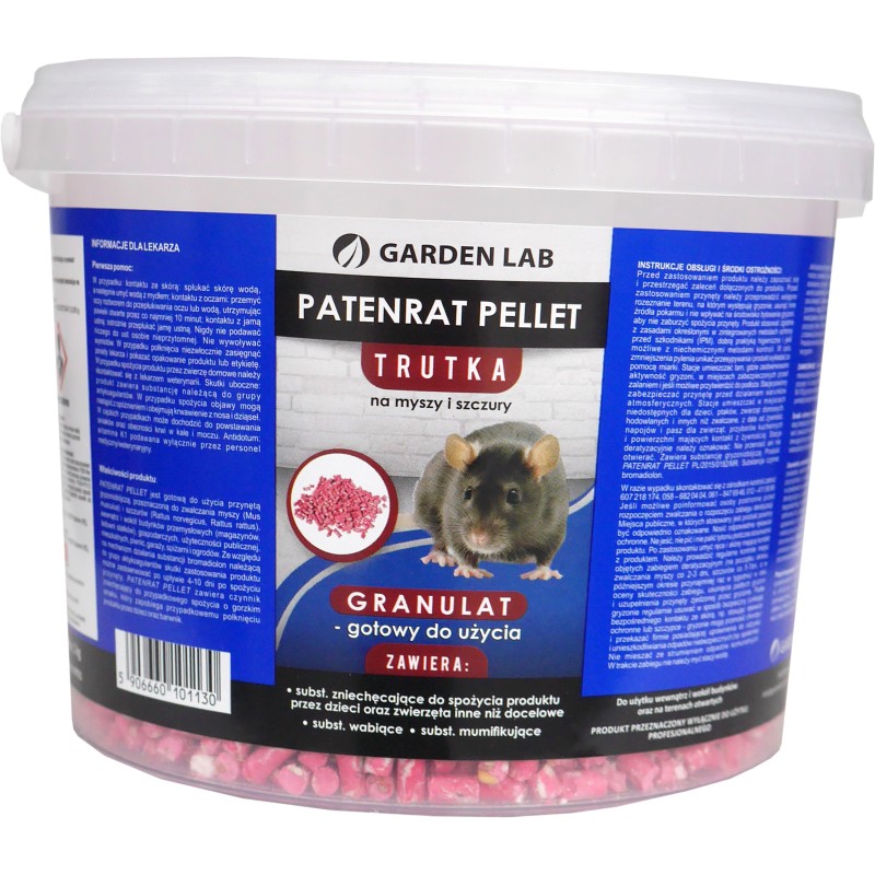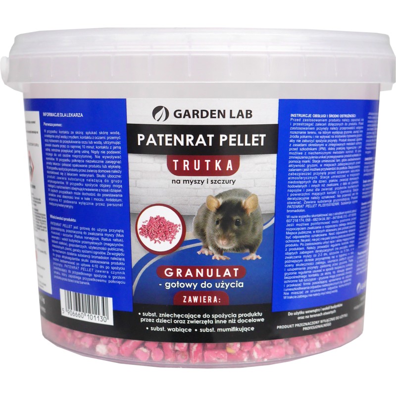 Granulat na myszy i szczury GARDEN LAB Patenrat Pellet to profesjonalny preparat gryzoniobójczy w formie granulatu, przeznaczony do skutecznego zwalczania myszy i szczurów. Dzięki starannie opracowanej recepturze, trutka charakteryzuje się wysoką atrakcyjnością dla gryzoni, co gwarantuje szybkie i skuteczne pobieranie przynęty.