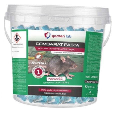 COMBARAT PASTA to profesjonalna przynęta w formie pasty przeznaczona do skutecznego zwalczania gryzoni. Dzięki zastosowaniu substancji czynnej o nazwie difenakum, preparat jest zabójczo skuteczny, a jednocześnie wykazuje mniejszą toksyczność dla zwierząt niebędących celem (takich jak psy czy koty) w porównaniu do innych rodentycydów, co czyni go bezpieczniejszym wyborem do stosowania w gospodarstwach domowych i rolnych.