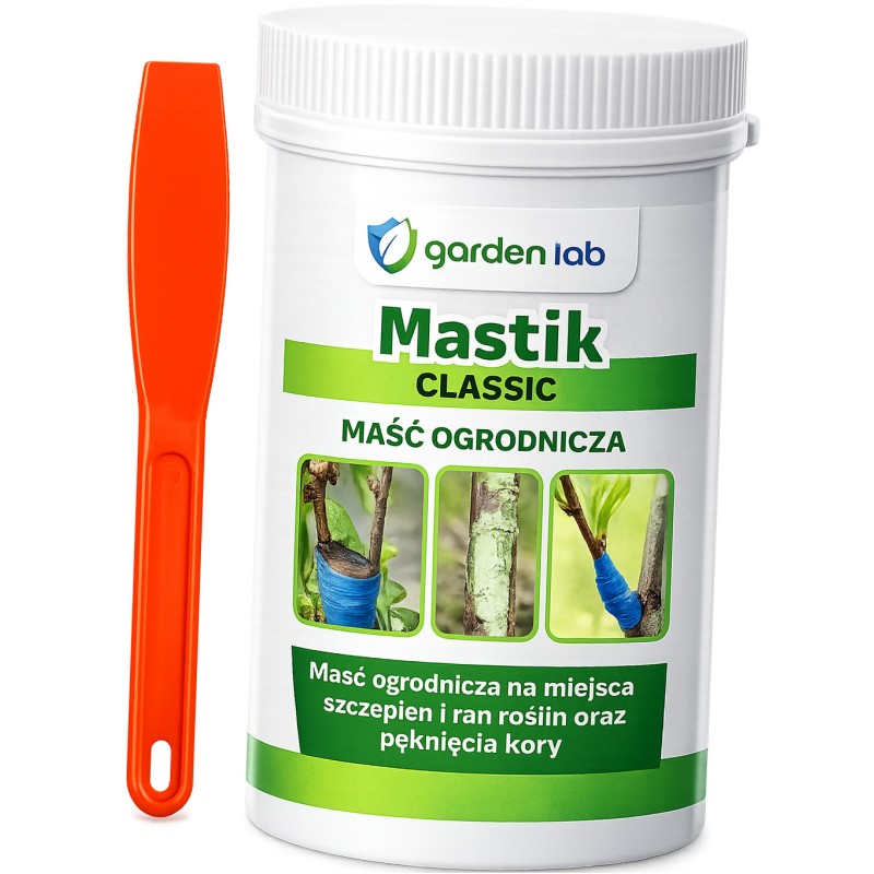 Mastik 250g Profesjonalna maść ogrodnicza od Garden Lab to niezbędnik w apteczce każdego ogrodnika i sadownika. Preparat został opracowany w celu zabezpieczania ran drzew i krzewów powstałych w wyniku przycinania, szczepienia, pęknięć mrozowych czy uszkodzeń mechanicznych wyrządzonych przez zwierzęta.