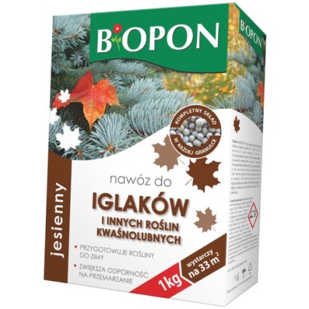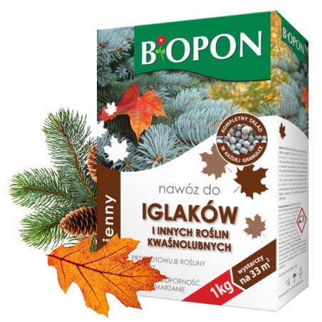 Wieloskładnikowygranulat o jednolitej konsystencji (kompletny skład w każdej granulce) do nawożenia doglebowego. Brak azotu hamuje przyrost roślin, a duża porcja potasu zwiększa odporność na wymarzanie. Nawóz zapewnia prawidłowe wybarwienie igieł i wspomaga proces drewnienia, przez co tworzy dodatkową ochronę przed mrozem. Optymalny dobór składników długotrwale uzupełnia niedobory minerałów w glebie i tworzy zapasy składników odżywczych potrzebnych do rozpoczęcia wegetacji w następnym sezonie.