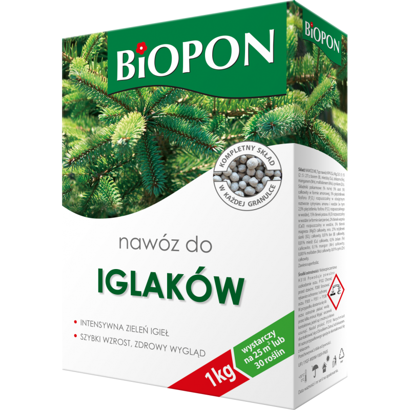 Specjalistyczny nawóz granulowanyo obniżonej zawartości chlorków, regulujący kwasowość podłoża odpowiednio do potrzeb drzew i krzewów iglastych. Zapewnia intensywne wybarwienie igieł i poprawia wygląd roślin. Działa kompleksowo, dostarczając iglakom wszystkich niezbędnych składników odżywczych.