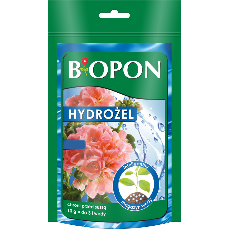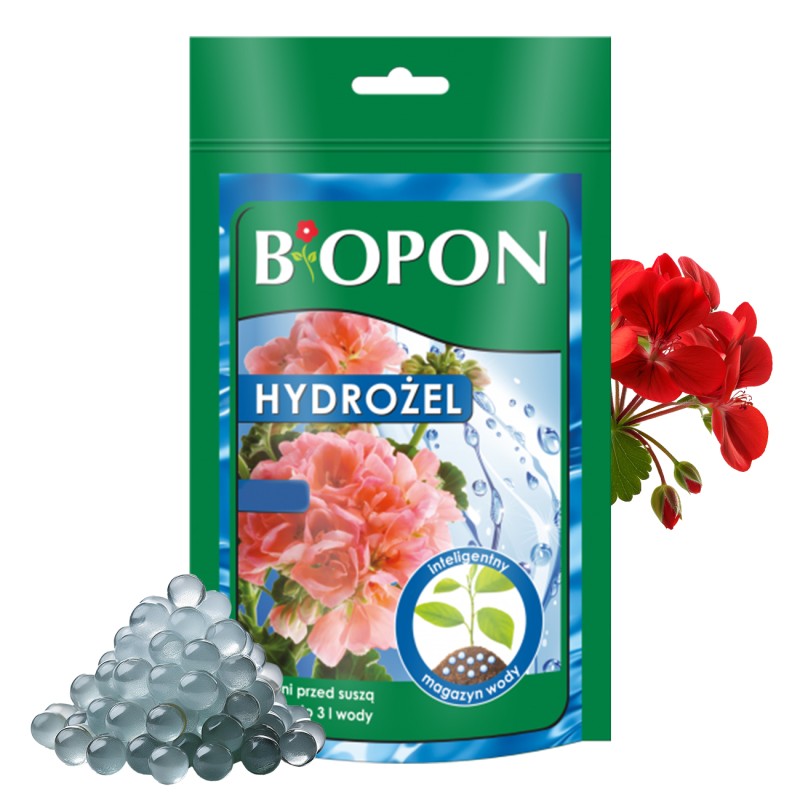 Mikrogranulat, który zwiększa chłonność podłoża i magazynuje w nim wodę. Granulki Hydrożelu wiążą wodę pochodzącą z podlewania, deszczu i rosy, zatrzymując jej nadmiar, a następnie stopniowo uwalniają do gleby. Dzięki temu rośliny nie odczuwają jej braku w okresach suszy lub zbyt rzadkiego podlewania, a z drugiej strony są chronione przed przelaniem.
