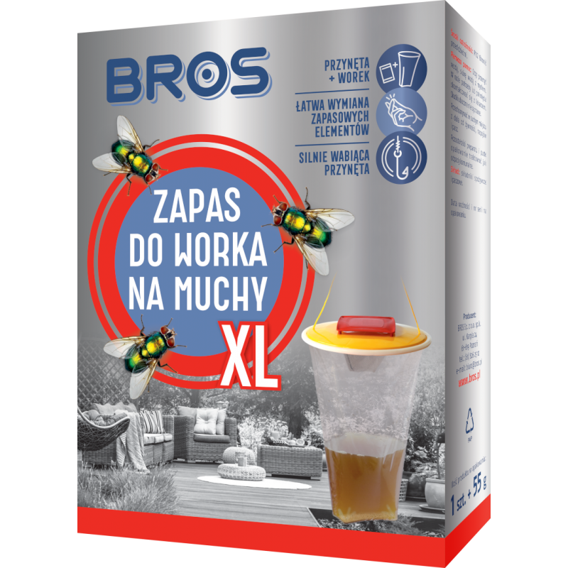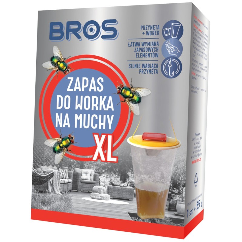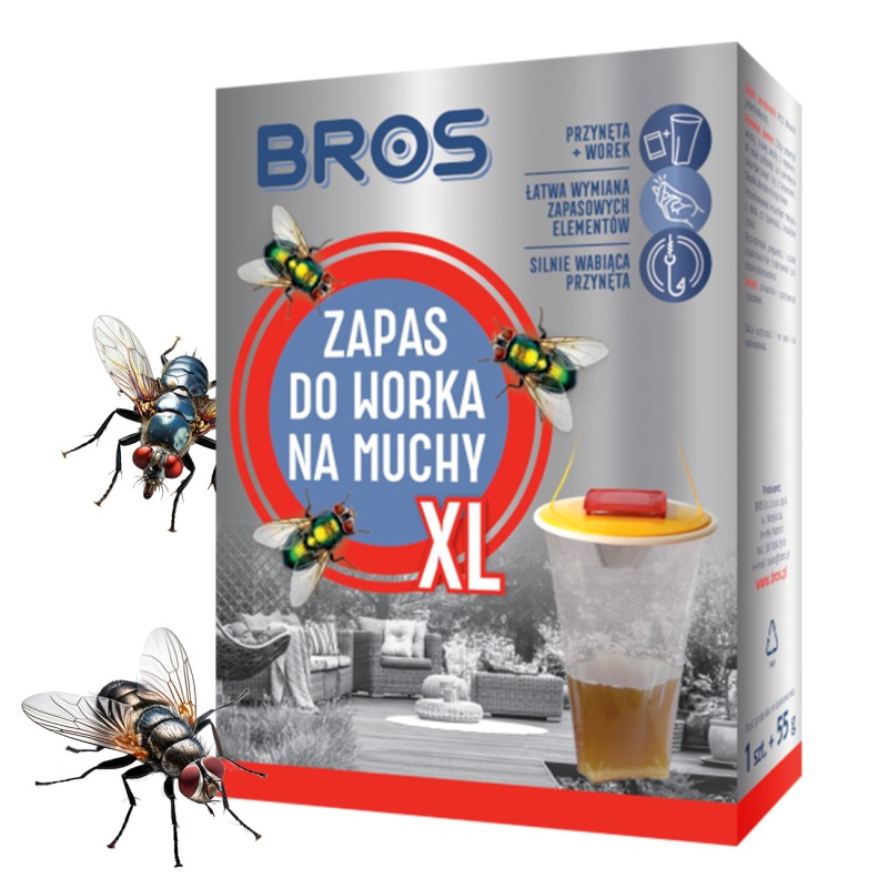 Zapas do worka na muchy XL - wyjątkowo skutecznej i bardzo pojemnej pułapki do monitorowania obecności much na terenach otwartych poprzez ich odławianie. Wyłapywanie much pozwala na wykrycie obecności tych owadów i ocenę ich ilości. Muchy wabione są naturalną, nietoksyczną przynętą umieszczoną wewnątrz pułapki, a specjalna konstrukcja produktu uniemożliwia wydostanie się ich ze środka. Pułapka nadaje się do monitorowania zdecydowanej większości gatunków much występujących na terenie Polski. BROS zapas do worka na muchy XL umożliwia wielokrotne wykorzystywanie jednej pułapki. Wystarczy wymienić w niej dwa wchodzące w skład zestawu elementy: