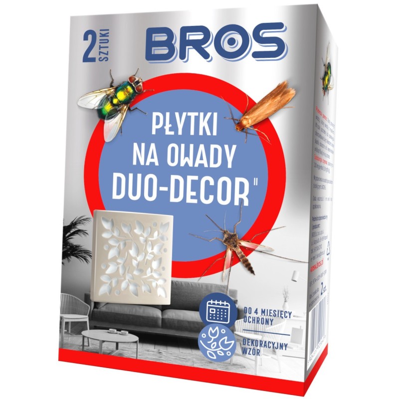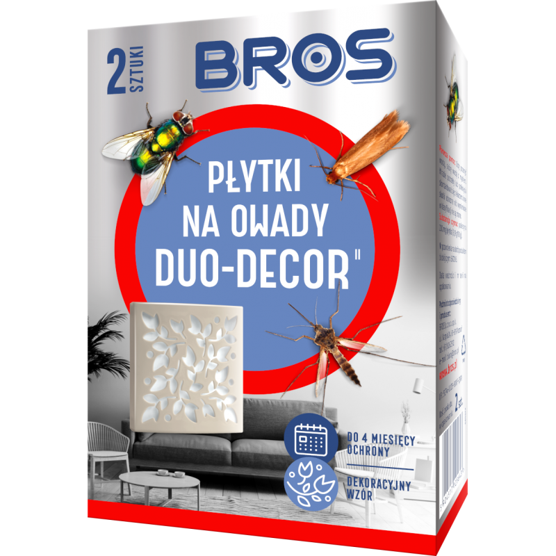 Dwie dekoracyjne płytki do zwalczania mrówek i owadów latających (muchy, komary, meszki, muszki owocówki i dorosłe osobniki moli odzieżowych) w pomieszczeniach. Mogą być stosowane razem lub osobno, w zależności od wielkości zabezpieczanej powierzchni. Subtelny, elegancki wzór w połączeniu z dyskretnym kolorem sprawiają, że płytki Duo-Decor pasują do każdego pomieszczenia. Płytka zaczyna działać od razu po rozpakowaniu, uwalniając stopniowo substancje aktywne, które wnikają w szczeliny i likwidują nawet głęboko ukryte owady. Pełna skuteczność występuje po ok. 48 godz. od jej wystawienia. Płytki stosowane jedna po drugiej, skutecznie chronią pomieszczenie aż do 4 miesięcy (obie płytki zapakowane są w oddzielne opakowania foliowe, które zabezpieczają substancję czynną przed jej uwalnianiem).