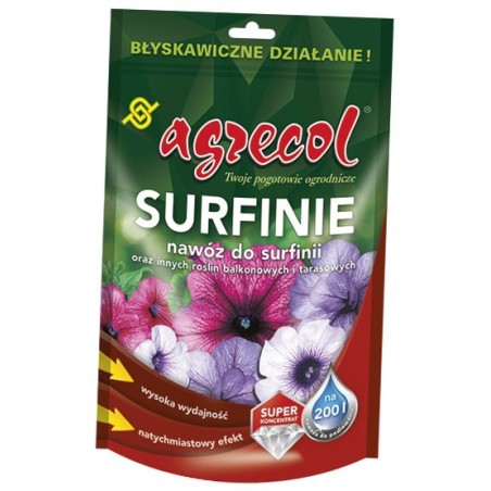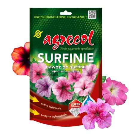 Surfinie – to nawóz krystaliczny do rozpuszczania w wodzie. Przeznaczony do odżywiania surfinii oraz innych petunii długo pędowych, również uprawianych w kompozycjach z innymi roślinami. Zawiera komplet makro- i mikroskładników dostosowanych do potrzeb pokarmowych surfinii. Nawóz gwarantuje prawidłowy wzrost i rozwój roślin. Zapewnia wysoką zdrowotność nawożonych roślin, ich obfite i długotrwałe kwitnienie oraz intensywne wybarwienie kwiatów. Nawóz ten stosowany jest przez hodowców w profesjonalnych uprawach roślin balkonowych i rabatowych.