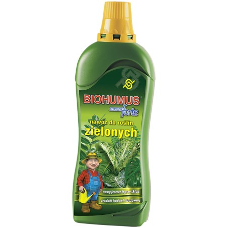 Biohumus Super Forte do roślin zielonych to płynny nawóz organiczno-mineralny. Przeznaczony do nawożenia wszelkich roślin zielonych i ozdobnych z liści, uprawianych w domu, na balkonie, na tarasie i w ogrodzie. Polecany także w nawożeniu roślin kwitnących w okresach pomiędzy kwitnieniem. Nawóz wspomaga tworzenie bujnej zielonej masy liści. Nawóz można stosować w uprawach roślin domowych i balkonowych, ozdobnych z liści, np.: zamiokulkasów, difenbachii, bluszczy, palm, fikusów, begonii, zielistek, kocanek, komarzyc i wielu innych. Także w uprawach roślin ogrodowych ozdobnych z liści, np.: funkii, żurawek, bruner, trzmielin i wielu innych.