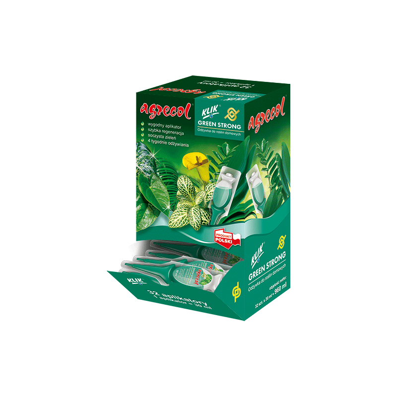 Green Strong – odżywka do roślin domowych. Specjalistyczny i wyjątkowo innowacyjny preparat przeznaczony do regeneracji wszystkich gatunków roślin doniczkowych. Specjalna formuła ułatwia pobieranie składników oraz wzmacnia system odpornościowy roślin. Regularne stosowanie wpływa na dobrą kondycję systemu korzeniowego. Odżywka dodatkowo zapewnia sprężystość liści oraz ich odpowiednie soczyste wybarwienie. Profesjonalne, estetyczne i gotowe do użycia aplikatory ułatwiają stosowanie. Odżywka do roślin domowych Green Strong została zaprojektowana tak, aby mogła wzmacniać je przez cały rok. Należy pamiętać, że uprawiane w doniczkach rośliny należą do roślin tropikalnych, dla których okres wegetacji w warunkach naturalnych trwa przez cały rok. W związku z tym w celu uzyskania najlepszych efektów uprawy, należy stworzyć dla nich odpowiednie warunki w okresie wszystkich 12 miesięcy w roku.