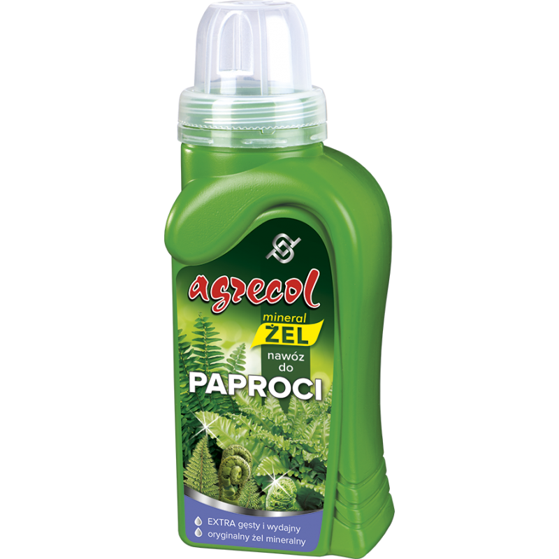 Nawóz do paproci z serii Mineral żel to płynny nawóz mineralny w postaci żelu, do rozpuszczania w wodzie. Przeznaczony do zasilania wszelkich odmian paproci zarówno domowych, jak i ogrodowych. Zalecany do stosowania w uprawach paproci domowych, np.: nefrolepisa, adiantum, dawali mariesa, asplenium gniazdowego, łosich rogów, ciemnotki okrągłolistnej, flebodium. Doskonale sprawdza się również w uprawach paproci ogrodowych, np.: pióropusznika strusiego, długosza królewskiego, nerecznicy samczej, onoklei wrażliwej, wietlicy, paprotki zwyczajnej, zanokcicy, języcznika zwyczajnego. Żelowa formuła nawozu bardzo łatwo rozpuszcza się w wodzie. Roztwór nawozowy można z powodzeniem stosować do nawożenia roślin uprawianych metodami tradycyjnymi, a także w uprawach hydroponicznych.