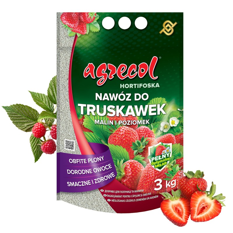 Hortifoska nawóz do truskawek, malin i poziomek to granulowany nawóz mineralny. Przeznaczony do nawożenia truskawek, malin, poziomek, jeżyn, porzeczek, agrestu, aronii oraz innych krzewów owocowych w uprawach tradycyjnych i pod osłonami. Dzięki zastosowaniu tego nawozu plony są obfite, a owoce dobrze wykształcone, prawidłowo wybarwione i bardzo smaczne. Zawarte w nawozie żelazo oraz magnez zapobiegają chlorozie.