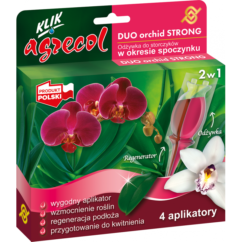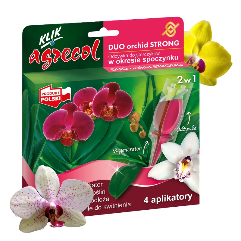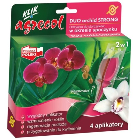 Duo Orchid Strong – odżywka do storczyków w okresie spoczynku. Specjalistyczny i wyjątkowo innowacyjny preparat przeznaczony do regeneracji wszystkich gatunków i odmian storczyków. Produkt przeznaczony jest do stosowania przez cały okres wegetacji. W szczególności zalecany jest w okresie po przekwitnięciu roślin, w celu ich wzmocnienia i przygotowania do kolejnego kwitnienia. Zawarte w odżywce ekstrakty substancji humusowych, identyczne do tych występujących naturalnie w zakamarkach konarów oraz korze drzew tropikalnych, przyspieszają regenerację podłoża i wpływają pozytywnie na korzenie storczyków. Profesjonalne i estetyczne aplikatory są łatwe w użyciu.