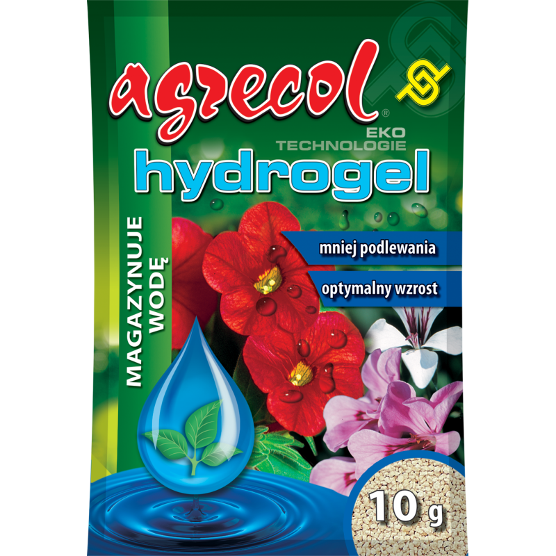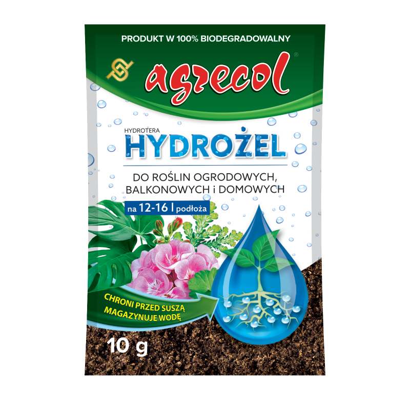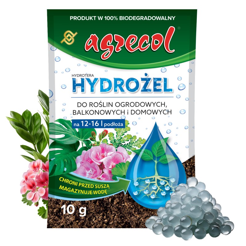 Hydrogel to produkt w postaci mikrokryształków przeznaczony do magazynowania wody w glebie. Preparat jest przeznaczony dla roślin doniczkowych – uprawianych w domu na balkonie i tarasie, a także dla roślin uprawianych bezpośrednio w gruncie – w ogrodzie i na działce. Mikrokryształki wchłaniają wodę i składniki pokarmowe, tworząc miękki hydrożel. W okresie suszy rośliny pobierają wodę zawartą w hydrogel’u. Preparat przyczynia się do lepszego wykorzystania składników pokarmowych. Stosowanie hydrogel’u przyspiesza kiełkowanie nasion i wzrost młodych roślin. Wpływa pozytywnie na ukorzenianie się sadzonek i tworzenie rozbudowanego systemu korzeniowego. Korzystnie oddziałuje na wzrost części nadziemnej oraz poprawia kondycję roślin. Proces pobierania i oddawania wody przez mikrokryształki może następować wielokrotnie w ciągu całego okresu wegetacji, co ogranicza straty wody z podłoża.
