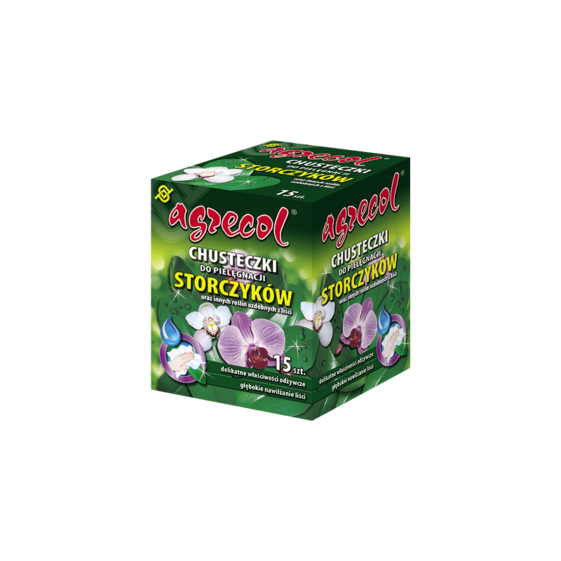 Wilgotne pielęgnacyjne chusteczki do storczyków oraz innych roślin ozdobnych z liści. Służą do regularnego czyszczenia atrakcyjnych liści storczyków. Chusteczki odpowiednio nawilżają liście, ograniczają osadzanie się kurzu i innych osadów, zapobiegają powstawaniu plam oraz delikatnie odżywiają. Do stosowania w ciągu całego roku. Chusteczki usuwają wszelkie zanieczyszczenia z liści: pyły, kurz oraz osady powstałe wskutek pryskania roślin twardą nieodstaną wodą.