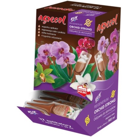 Orchid Strong Regenerum – odżywka do storczyków z regeneratorem podłoża. Specjalistyczny i wyjątkowo innowacyjny preparat przeznaczony do regeneracji wszystkich gatunków storczyków. Specjalna formuła pobudza, wzmacnia i przedłuża kwitnienie. Zawarte w odżywce ekstrakty substancji humusowych identyczne do tych występujących w zakamarkach konarów oraz korze drzew tropikalnych, wpływają regenerująco na podłoże, w którym rosną storczyki. Ogranicza to konieczność częstego przesadzania roślin. Profesjonalne, estetyczne i gotowe do użycia aplikatory ułatwiają stosowanie.