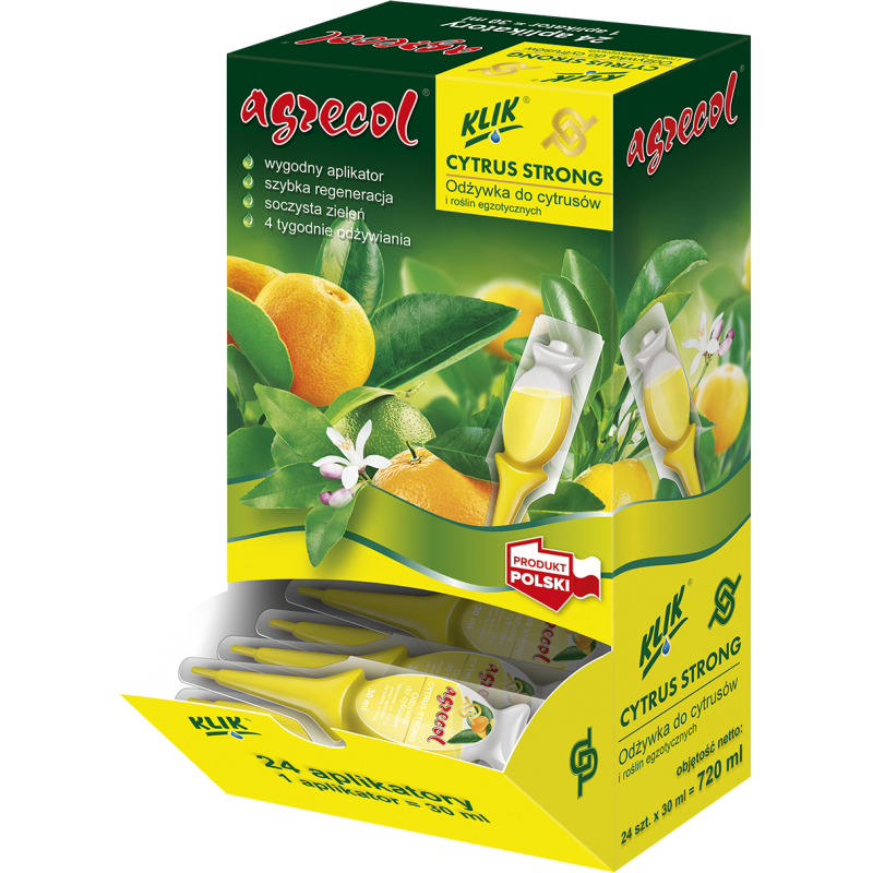 Cytrus Strong – odżywka do cytrusów. Specjalistyczny i wyjątkowo innowacyjny preparat przeznaczony do regeneracji wszystkich gatunków i odmian roślin cytrusowych oraz innych roślin egzotycznych. Specjalna formuła ułatwia pobieranie składników oraz wzmacnia rośliny. Regularne stosowanie wpływa na dobrą kondycję systemu korzeniowego, zapewnia soczyste wybarwienie liści oraz lepsze owocowanie. Profesjonalne i estetyczne aplikatory są łatwe w użyciu.
