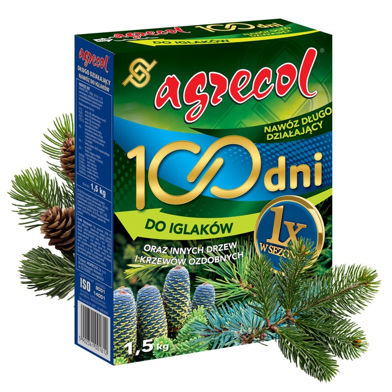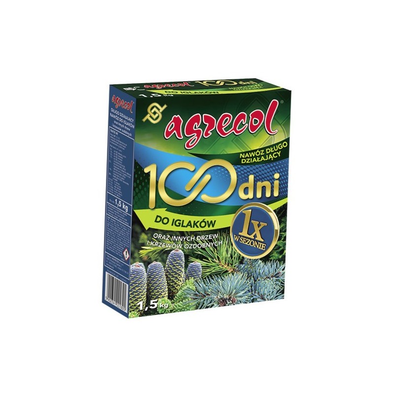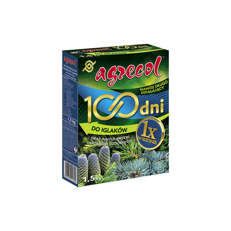 100 dni nawóz do iglaków to nawóz w postaci granulowanej z makro- i mikroskładnikami o szybkim, a jednocześnie długotrwałym działaniu. Przeznaczony do nawożenia roślin iglastych oraz innych drzew i krzewów. Polecany również do stosowania w wymagających uprawach liściastych roślin ozdobnych. Nawóz doskonale sprawdza się także do zasilania bardzo często przycinanych żywopłotów, ponieważ zapewnia im szybką regenerację. Stopniowo uwalniane składniki pokarmowe zmniejszają ryzyko przenawożenia.