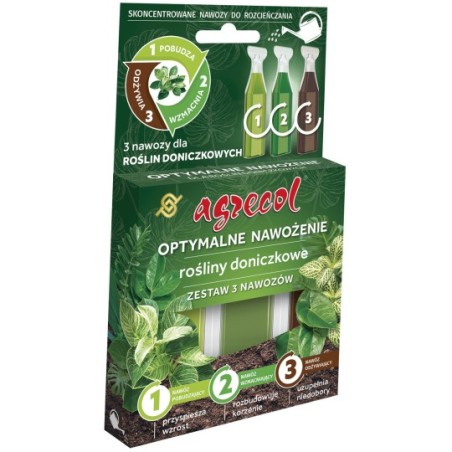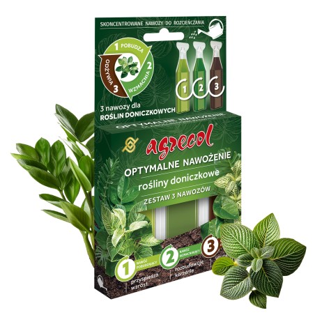 Zestaw trzech różnych nawozów mineralnych, każdy o innej kompozycji składników pokarmowych, stymulujących rozmaite procesy życiowe roślin. Nawozy te zostały skomponowane z myślą o roślinach doniczkowych. Ampułki możesz stosować po rozpuszczeniu z wodą w dowolnej kolejności, zachowując 3 tygodniowe odstępy stosowania pomiędzy kolejną ampułką nawozową.