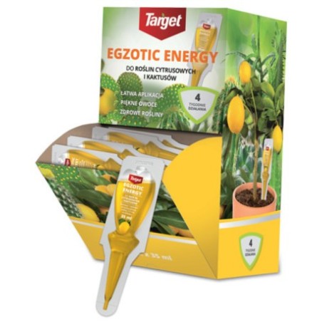 EFZOTIC ENERGY to innowacyjny gotowy do użycia preparat przeznaczony do zasilania roślin cytrusowych i kaktusów. Specjalnie dobrany skład zapewnia prawidłowy i zdrowy wzrost roślin, inicjuje wytwarzanie pąków oraz poprawia witalność roślin. Dodatek aktywatora metabolicznego powoduje, że substancje odżywcze są w szybki i łatwy sposób przyswajane przez roślinę, a jej wzmocniony system korzeniowy działa wydajniej. Samodozujący aplikator gwarantuje łatwość i wygodę stosowania. Pojedyncza ampułka zaopatruje roślinę w niezbędne substancje odżywcze przez okres aż do 4 tygodni.