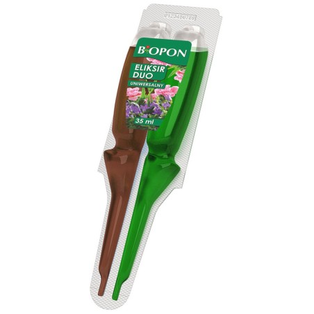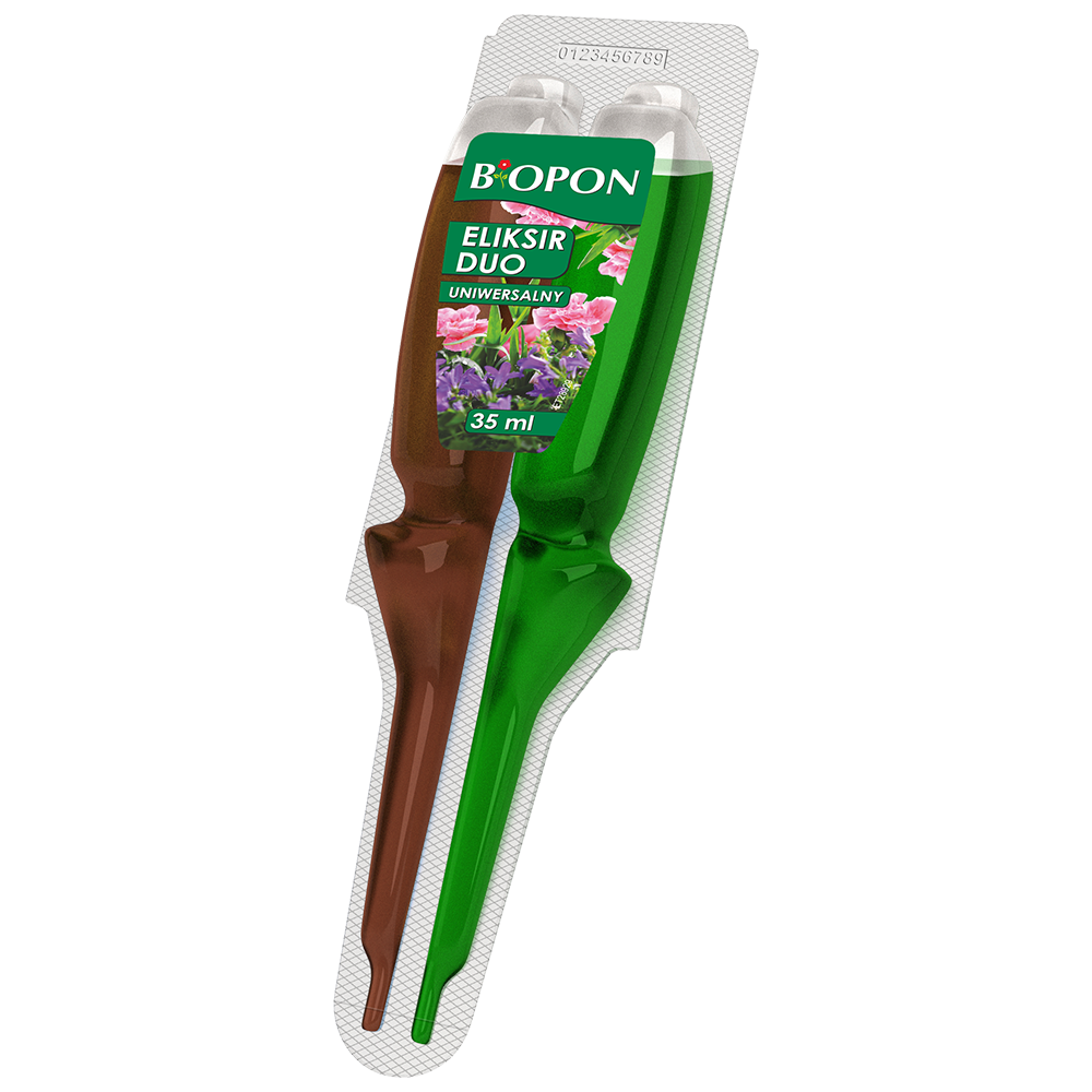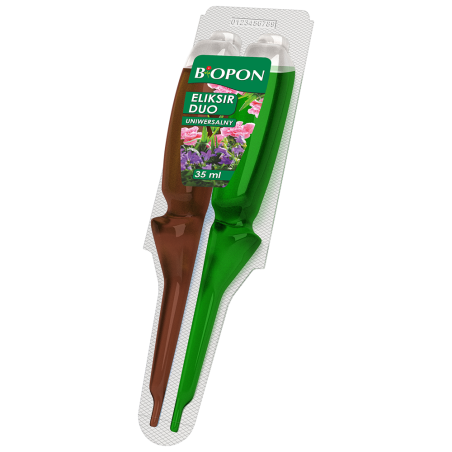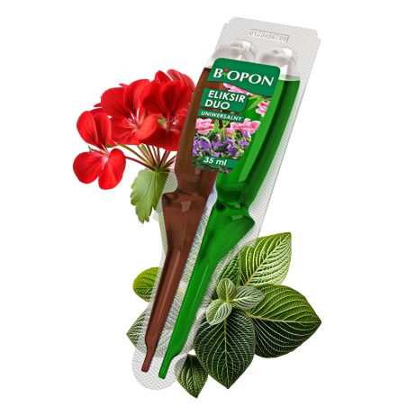 Innowacyjny, dwuskładnikowy preparat przeznaczony do zasilania i szybkiej regeneracji roślin ozdobnych, hodowanych w domu i na balkonie. Zalecany w szczególności do kwiatów z problemami (powolny wzrost, słabe kwitnienie, mizerny wygląd), ale może być również stosowany profilaktycznie u roślin w dobrej kondycji. Zielona odżywka dostarcza im podstawowy pokarm, niezbędny do prawidłowego wzrostu i kwitnienia, a brązowy regenerator wzmacnia, redukuje stres wywołany przesadzaniem lub nieprawidłową pielęgnacją i przywraca im ogólną równowagę. Połączone działanie odżywki i regeneratora sprawia, że rośliny odzyskują witalność, zdrowy wygląd oraz piękne wybarwienie kwiatów i liści. Zastosowanie dwuczęściowego aplikatora, dozującego jednocześnie odpowiednią ilość odżywki i regeneratora sprawia, że aplikacja obu preparatów jest wyjątkowo łatwa i wygodna. Dzięki temu, że oba płyny umieszczone są w osobnych przegrodach, dłużej zachowują swoje cenne właściwości. Do ich zmieszania dochodzi dopiero w podłożu, przez co składniki odżywcze i regenerujące są łatwiej przyswajane przez rośliny.
