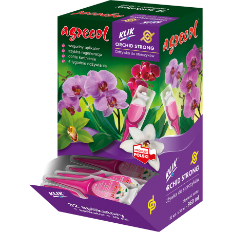 Orchid Strong – odżywka do storczyków. Specjalistyczny i wyjątkowo innowacyjny preparat przeznaczony do regeneracji wszystkich gatunków storczyków. Może być używana w uprawie storczyków z rodzajów: falenopsis (Phalenopsis), dendrobium (Dendrobium), cymbidium (Cymbidium), a także wielu wielu innych. Specjalna formuła pobudza, wzmacnia i przedłuża kwitnienie. Regularne stosowanie wpływa na dobrą kondycję systemu korzeniowego. Odżywka zapewnia odpowiednią sprężystość liści oraz ich soczysto zielone wybarwienie. Profesjonalne, estetyczne i gotowe do użycia aplikatory ułatwiają stosowanie.