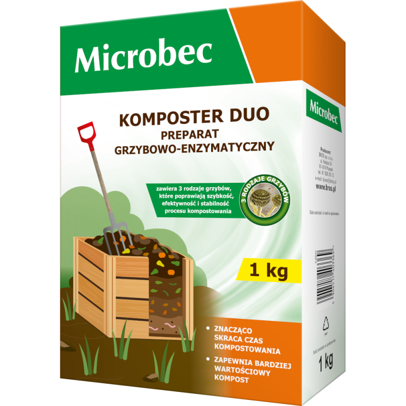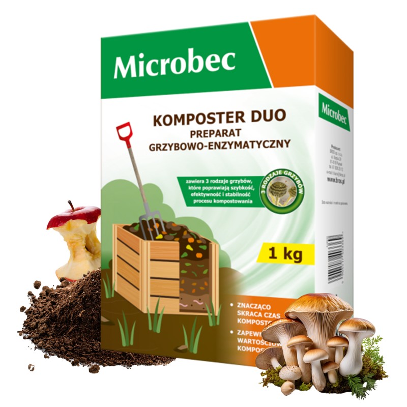 MICROBEC Komposter DUO to innowacyjny preparat mikrobiologiczny, który znacząco przyspiesza proces kompostowania odpadów organicznych. Jego unikalna formuła zawiera trzy rodzaje pożytecznych grzybów strzępkowych: