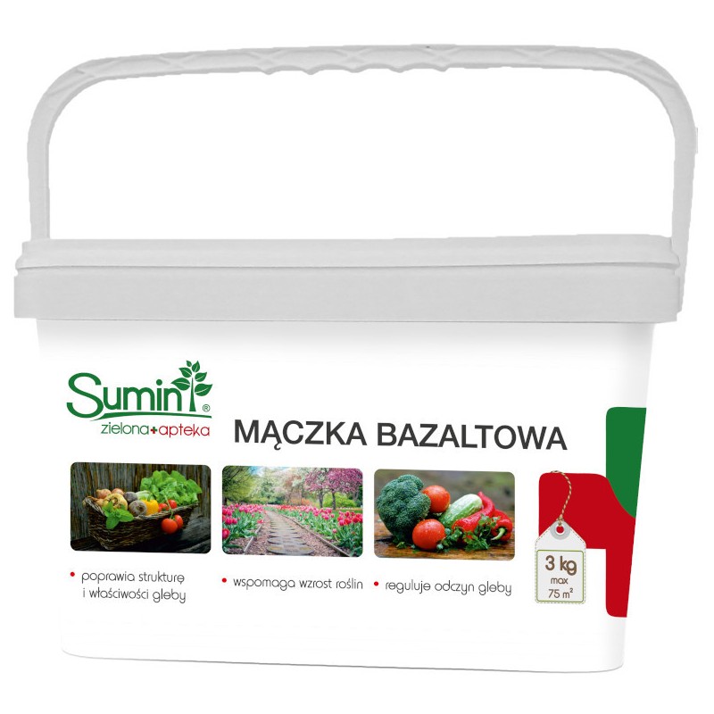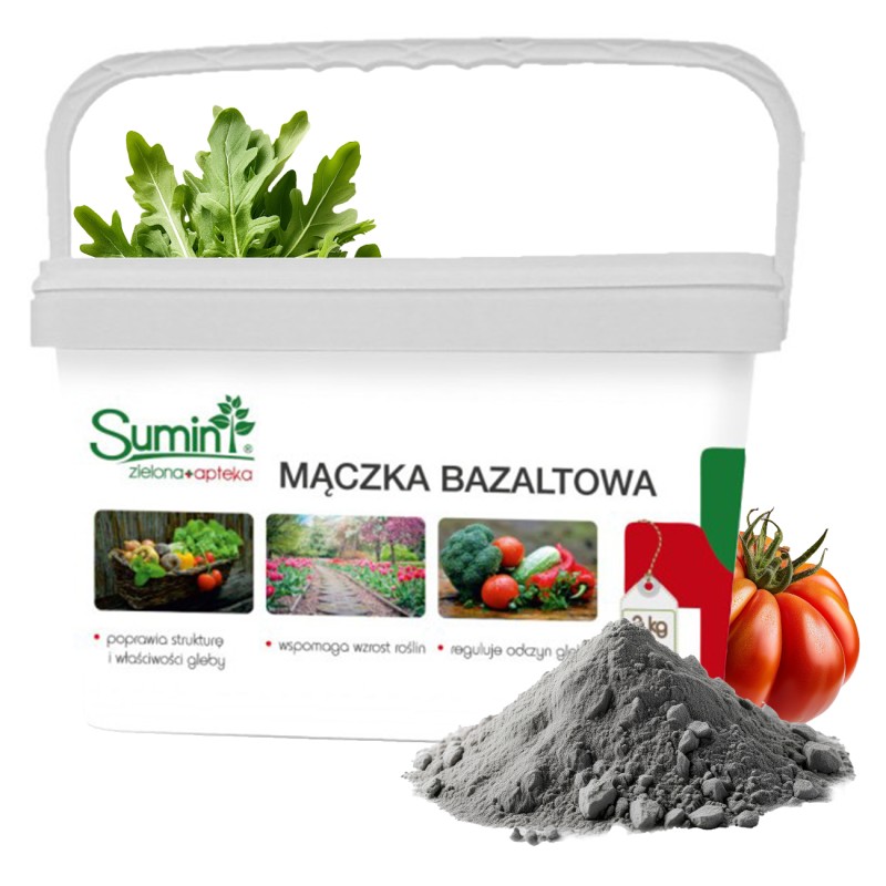 Mączka bazaltowa marki Sumin to naturalny, mineralny środek poprawiający właściwości fizyko-chemiczne gleby, wspomagający wzrost roślin. Składa się głównie z tlenku krzemu (krzemionki), która nadaje twardość łodygom, zabezpieczając je przed atakami chorób i szkodników. Zawiera także około 20% tlenku glinu, 5-10% tlenku żelaza oraz magnez, wapń i sód. Mączka bazaltowa ma odczyn pH około 7,6, co oznacza, że jest zasadowa.
