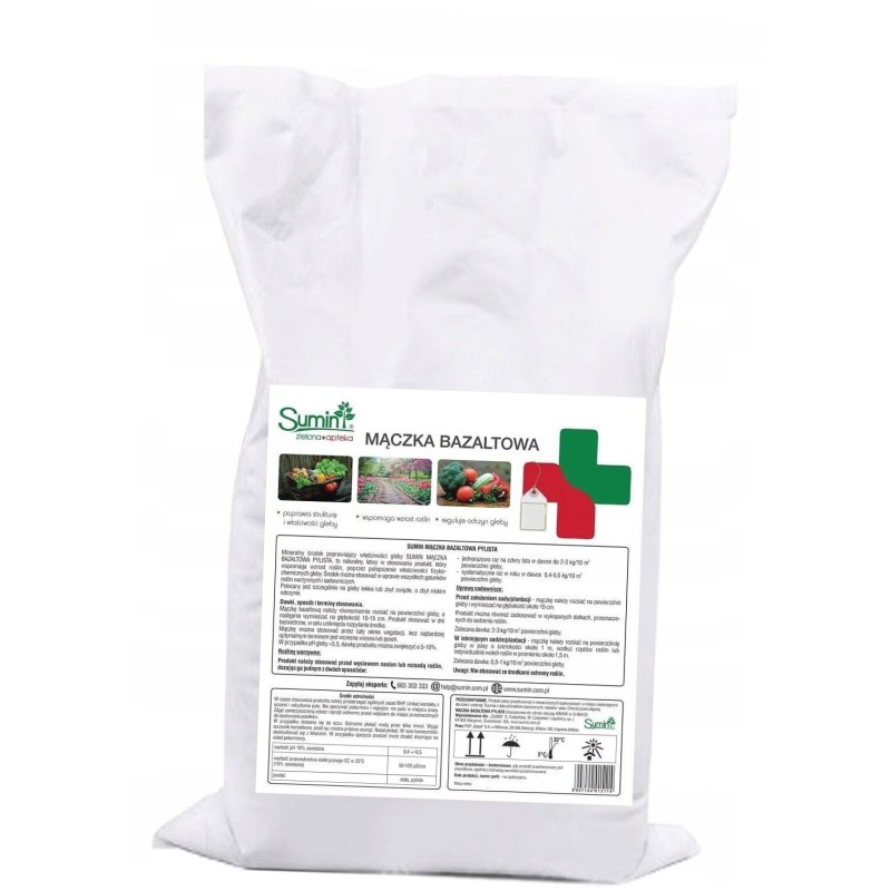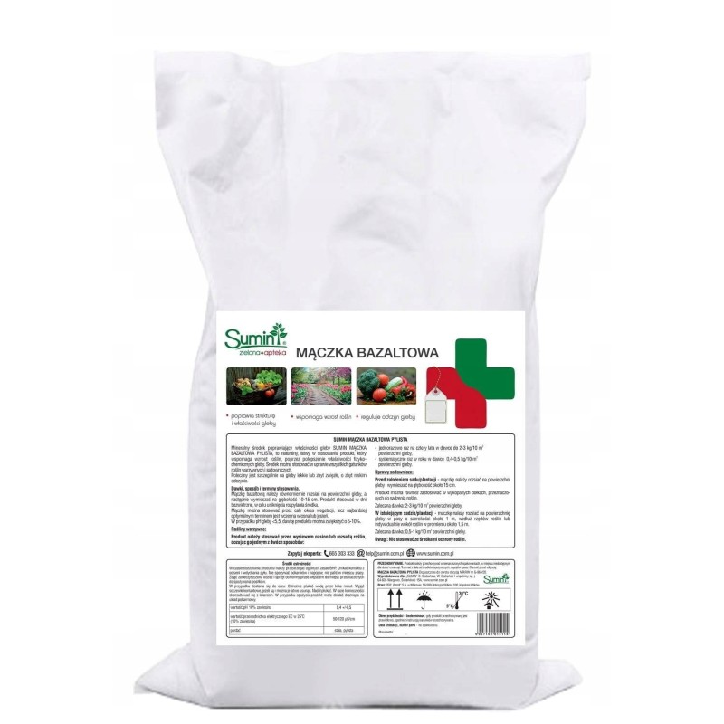 Mączka bazaltowa marki Sumin to naturalny, mineralny środek poprawiający właściwości fizyko-chemiczne gleby, wspomagający wzrost roślin. Składa się głównie z tlenku krzemu (krzemionki), która nadaje twardość łodygom, zabezpieczając je przed atakami chorób i szkodników. Zawiera także około 20% tlenku glinu, 5-10% tlenku żelaza oraz magnez, wapń i sód. Mączka bazaltowa ma odczyn pH około 7,6, co oznacza, że jest zasadowa.
