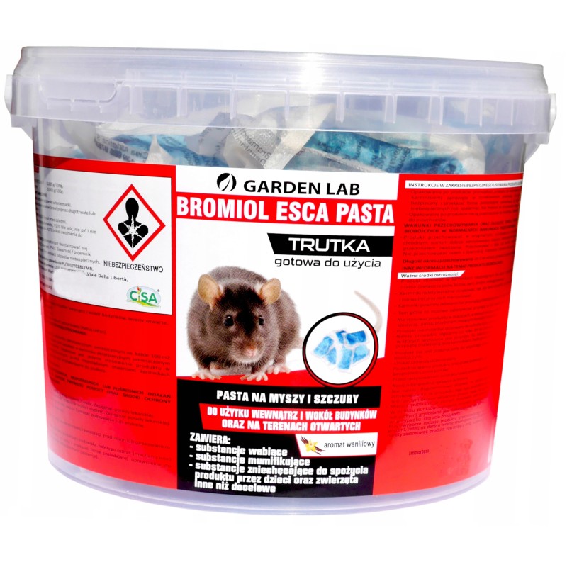 BROMIOL ESCA PASTA to gotowa do użycia, profesjonalna przynęta gryzoniobójcza o skutecznym działaniu przeciw myszy domowej (Mus musculus) oraz szczurów (Rattus norvegicus, Rattus rattus). Dzięki zawartości substancji czynnej – Bromadiolonu, działa już po jednorazowym spożyciu. Formulacja miękkiej pasty oparta jest na atrakcyjnych dla gryzoni składnikach spożywczych z dodatkiem aromatów i tłuszczy, co zwiększa jej skuteczność nawet w miejscach o dużym natężeniu konkurencyjnych źródeł pożywienia.