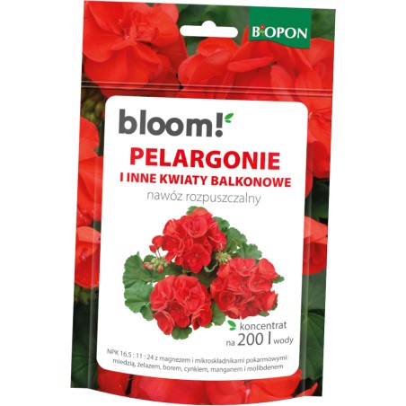 BLOOM! Pelargonie i inne rośliny balkonowe to specjalistyczny nawóz krystaliczny, łatwo rozpuszczalny w wodzie, przeznaczony do pielęgnacji wszystkich odmian pelargonii oraz innych kwiatów balkonowych i tarasowych. Dzięki starannie dobranej formule bogatej w niezbędne składniki pokarmowe, produkt zapewnia intensywny wzrost, zdrowy rozwój oraz piękne, wyraziste wybarwienie liści i kwiatów.