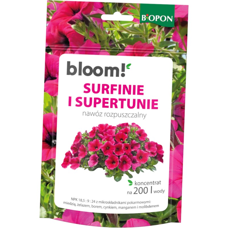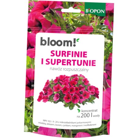 BLOOM! Surfinie i Supertunie to specjalistyczny nawóz krystaliczny, łatwo rozpuszczalny w wodzie, stworzony z myślą o potrzebach surfinii i supertunii. Dzięki starannie dobranym składnikom pokarmowym, produkt zapewnia optymalny wzrost roślin oraz obfite, wielokrotne kwitnienie.