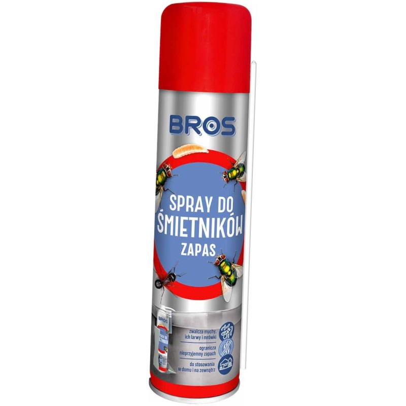 BROS Spray do Śmietników – ZAPAS to uzupełnienie skutecznego preparatu przeznaczonego do zwalczania much, ich larw oraz mrówek w pojemnikach na odpady. Dodatkowo neutralizuje nieprzyjemne zapachy, pozostawiając przyjemny cytrynowy aromat.