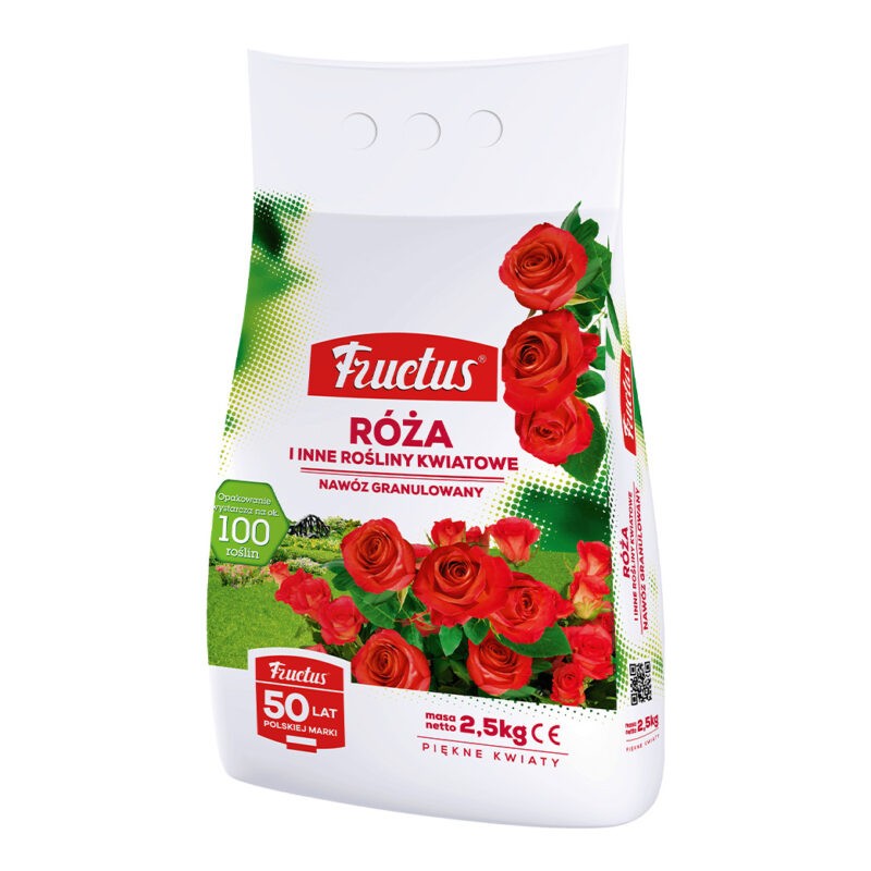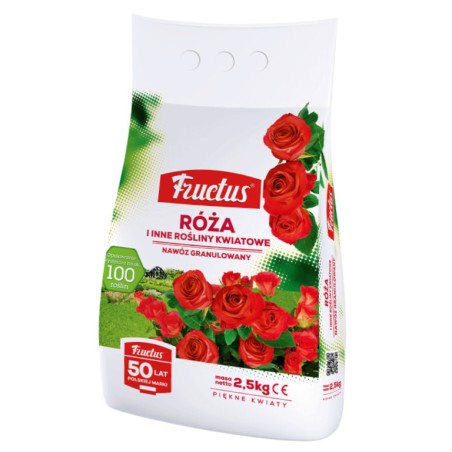 Fructus Nawóz ogrodniczy do róż to wieloskładnikowy, granulowany nawóz mineralny na bazie siarczanu potasu, przeznaczony do nawożenia wszystkich gatunków róż oraz innych roślin kwitnących uprawianych w glebie, na podłożach torfowych i korowo-torfowych. Dzięki starannie dobranej kompozycji makro- i mikroskładników pokarmowych, nawóz wspiera prawidłowy wzrost, rozwój i obfite kwitnienie roślin.