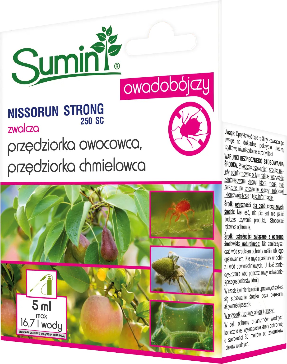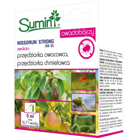 Środek przędziorkobójczy SUMIN Nissorun Strong 250 SC to profesjonalny koncentrat insektycydowy (preparat do rozcieńczania wodą) o działaniu kontaktowym i żołądkowym. Skutecznie likwiduje przędziorki: chmielowca i owocowego, w uprawach drzew owocowych (jabłoń, grusza), owoców jagodowych (truskawka) oraz warzyw pod osłonami (pomidor, papryka, ogórek). Działa na wszystkie formy szkodnika, poza osobnikami dorosłymi