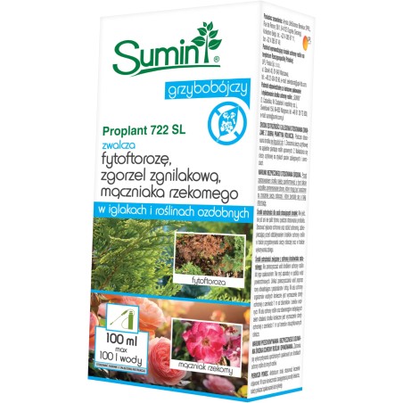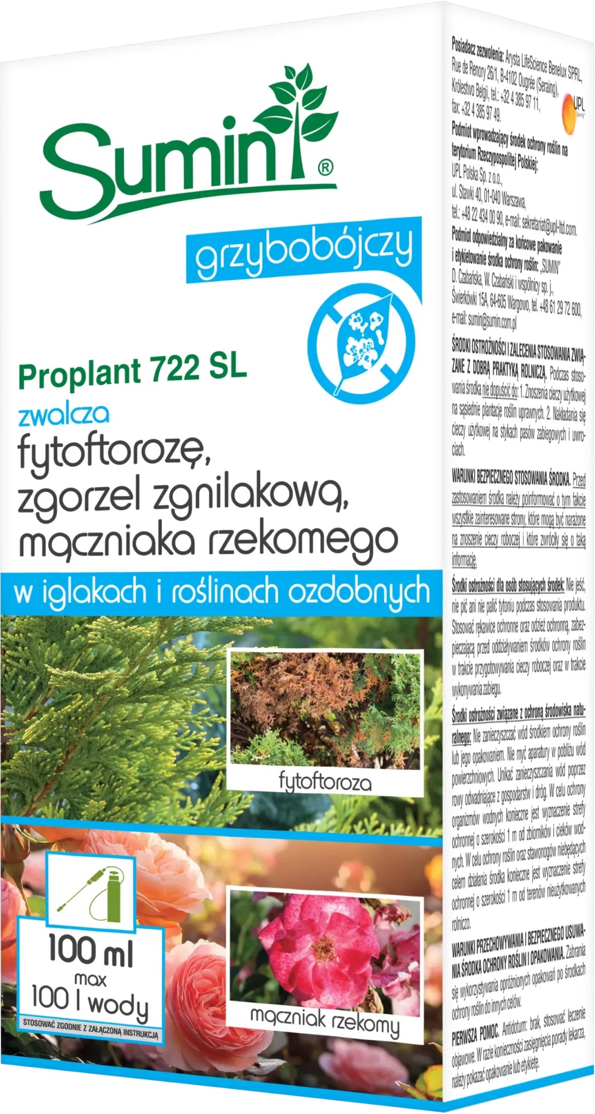 Środek na choroby grzybowe iglaków i roślin ozdobnych SUMIN Proplant 722SL to układowy fungicyd w formie koncentratu wodnego, przeznaczony do zapobiegawczego oraz interwencyjnego zwalczania chorób grzybowych, takich jak fytoftoroza, mączniak rzekomy czy zgorzel, w iglakach, roślinach ozdobnych oraz warzywach.