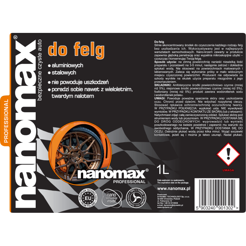 Płyn do czyszczenia felg i zapieczeń NANOMAX Professional 1L - to zaawansowany preparat, idealny dla entuzjastów motoryzacji i warsztatów samochodowych, którzy wymagają skuteczności i bezpieczeństwa przy codziennej pielęgnacji pojazdów.