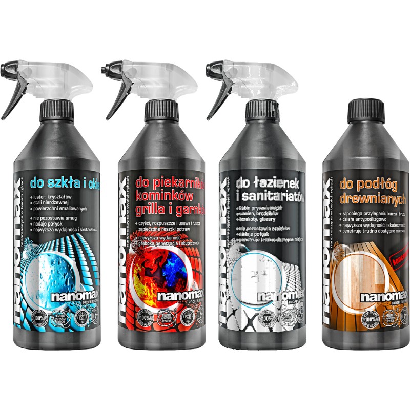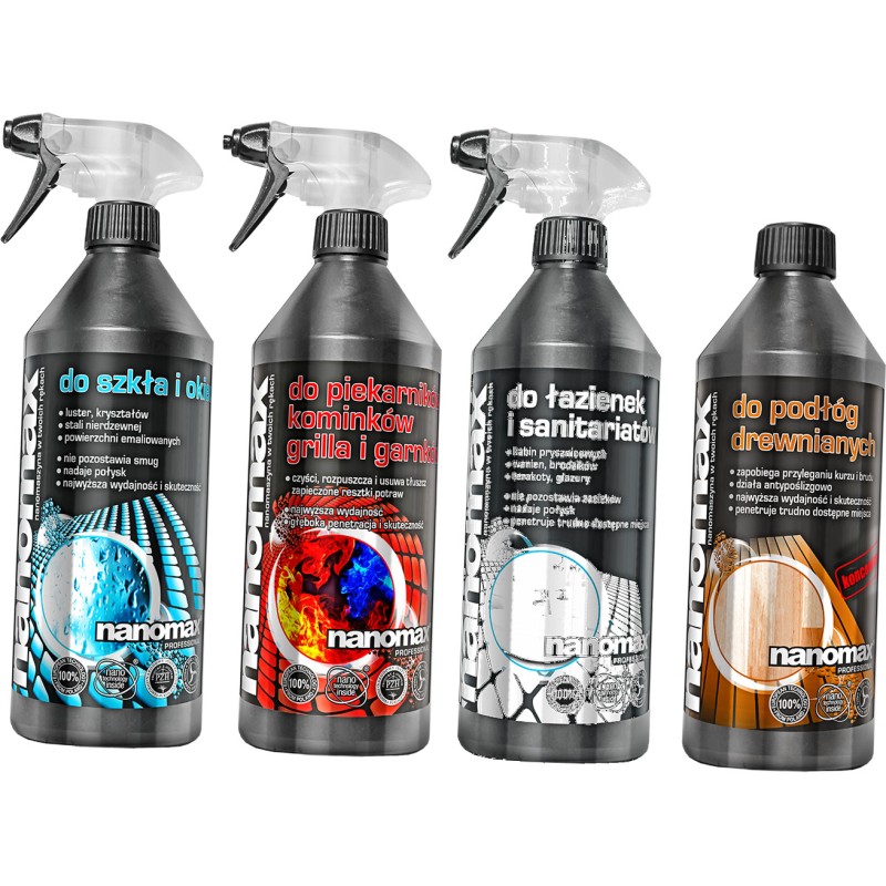 ZESTAW Płyn do czyszczenia szkła, piekarników, łazienek, podłóg drewnianych NANOMAX Professional 4x1L