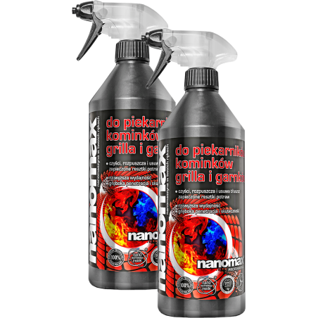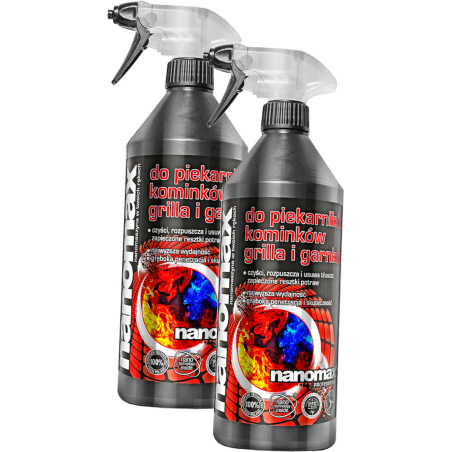 Płyn do czyszczenia piekarników, kominków, grilla i garnków NANOMAX Professional 1L - to specjalistyczny preparat stworzony z myślą o czyszczeniu silnie zanieczyszczonych powierzchni w grillach, piekarnikach, kominkach oraz rusztach. Dzięki silnej formule aktywnie rozpuszcza tłuszcz, sadzę i przypalone resztki, pozostawiając powierzchnie lśniąco czyste – bez konieczności intensywnego szorowania.