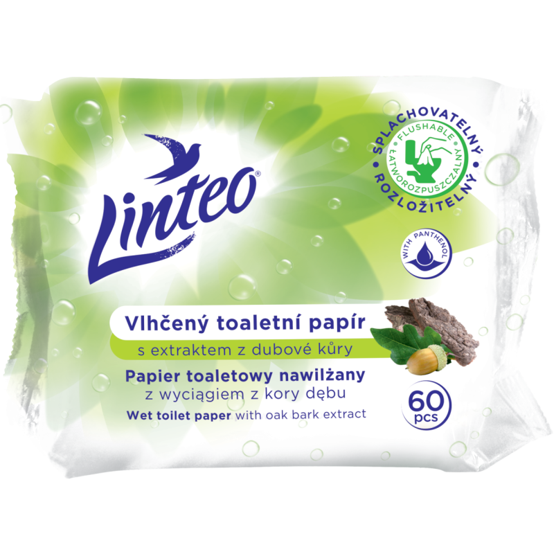 Nawilżany papier toaletowy Linteo z wyciągiem z kory dębu (60 szt.) zapewnia uczucie czystości i świeżości, pielęgnując skórę skłonną do podrażnień. Zawiera wyciąg z kory dębu, rumianku oraz pantenol, które nawilżają i łagodzą skórę. Produkt jest delikatny, wytrzymały, biodegradowalny i można go spłukiwać w toalecie. Dermatologicznie przetestowany, idealny do stosowania w domu i w podróży.