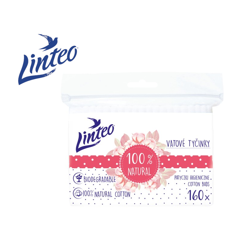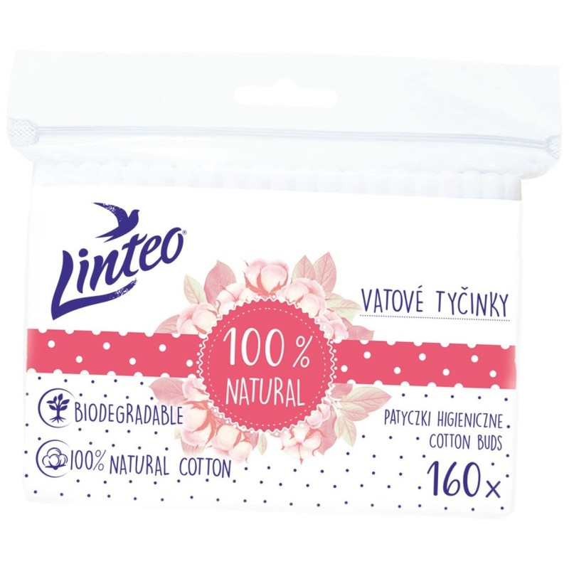 Patyczki kosmetyczne Linteo są wykonane z 100% bawełny oraz papieru pochodzącego w 100% z recyklingu. Są one dostępne w opakowaniu foliowym zawierającym 160 sztuk. Produkt należy do serii Linteo, zapewniając wysoką jakość i ekologiczne materiały.